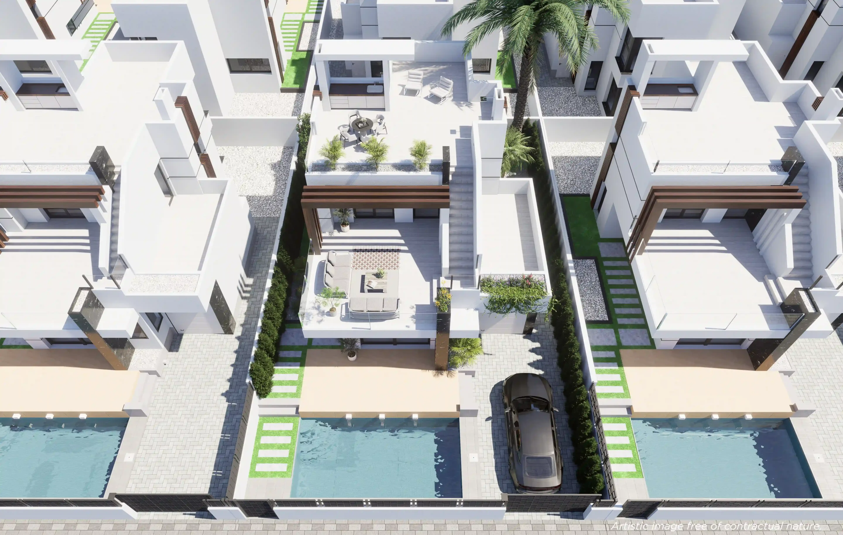 Each villa features three spacious bedrooms and three modern bathrooms, designed for optimal everyday comfort. The outdoor spaces are a major highlight, with a private pool, private parking, and a large solarium, perfect for relaxing under the Mediterranean sun.